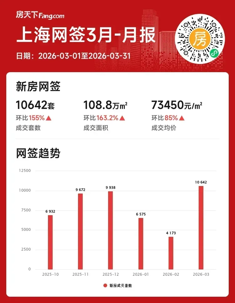 三月楼市传统“金三”旺季效应凸显,上海新房市场成交数据全线飘红,成交套数与面积环比增幅均超150%,市场活跃度与信心显著修复。📈