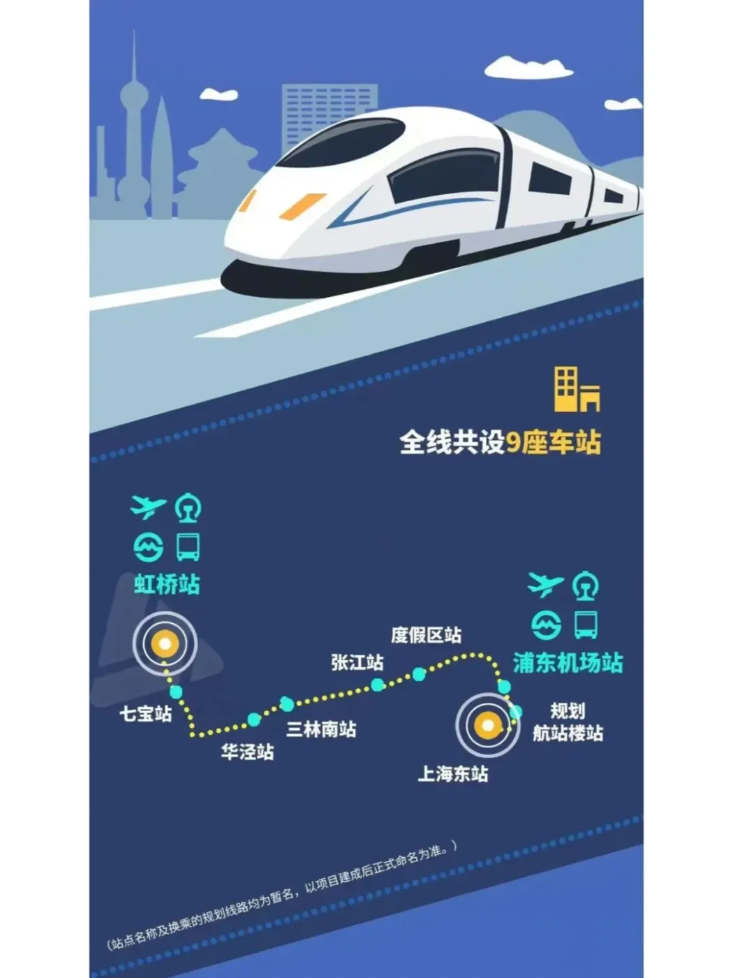 机场东西线线路全长68.6公里,设计时速100-160公里/小时,共设虹桥站、七宝站、华泾站、三林南站、张江站、度假区站、浦东机场站、浦东机场规划航站楼站、上海东站,共9座车站,将于9月1日试运行。