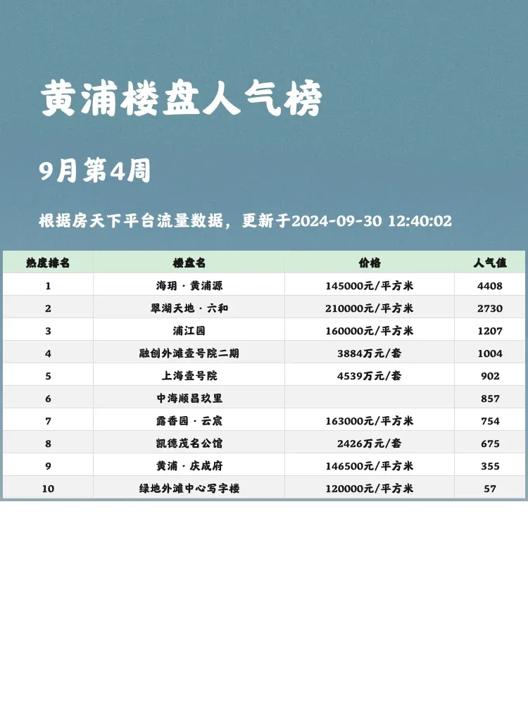 💡当前市场买房选房的核心逻辑就是:地段、配套和性价比🏡。人气楼盘榜单不仅为购房者提供了最热销的楼盘信息,也帮助大家在众多选择中找到最具价值的房源。接下来一起看看黄浦区的人气楼盘榜单,了解这些备受瞩目的楼盘吧!