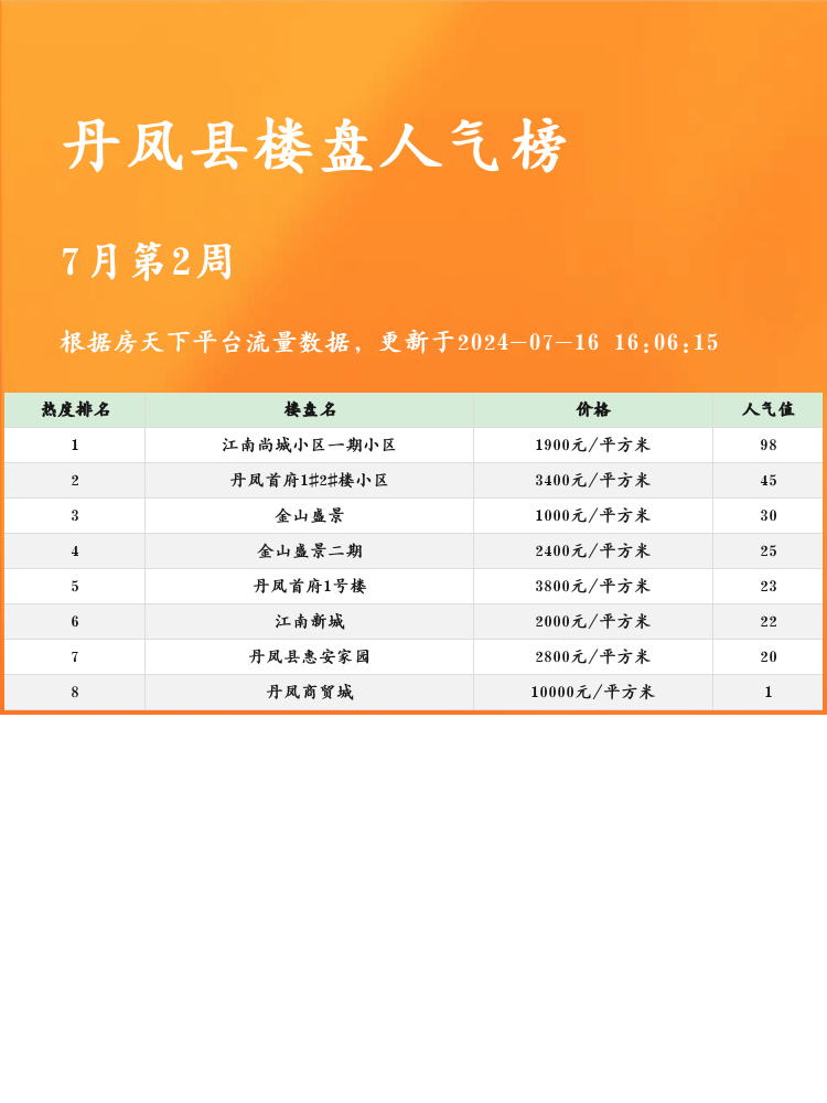💡 选房是一件大事,特别是在当前市场,找到合适的楼盘至关重要。为大家整理了丹凤县的人气楼盘榜单,目的就是帮助购房者掌握最新资讯,作出更明智的选择。以下是丹凤县人气榜前三名楼盘,看看有没有你心仪的吧!🏠