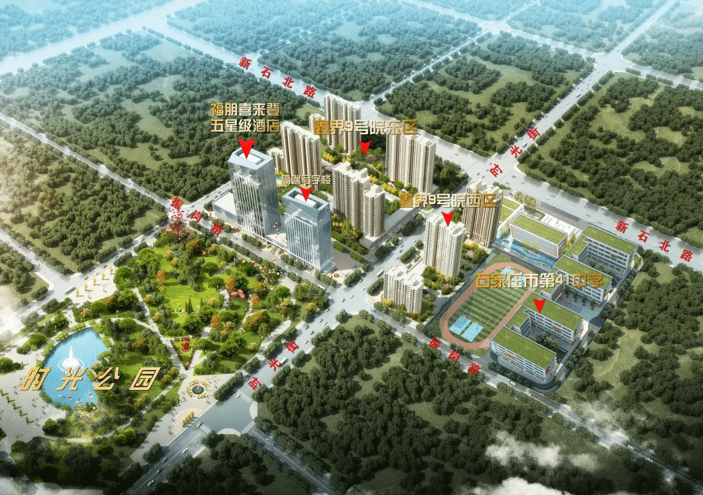 鑫界9号院鸟瞰图,临时光公园和石家庄市第四十一中学。优惠详询售楼部
