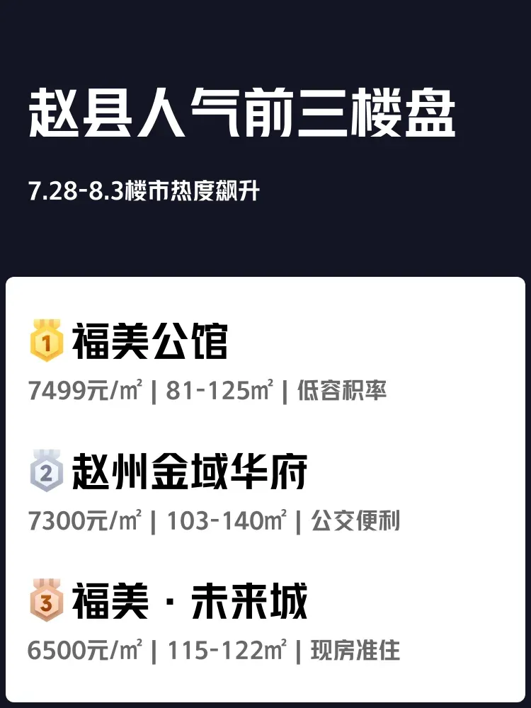 📊赵县上周(7.28-8.3)看房热度持续飙升!有粉丝吐槽"每天通勤3小时 vs 家门口上班,你会怎么选?"整理了人气前三楼盘真实数据👇