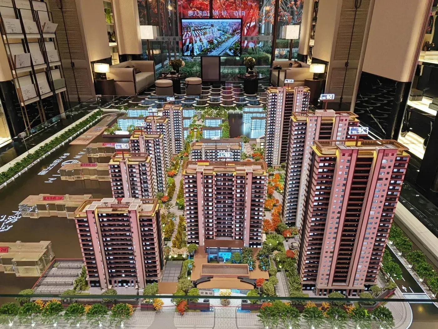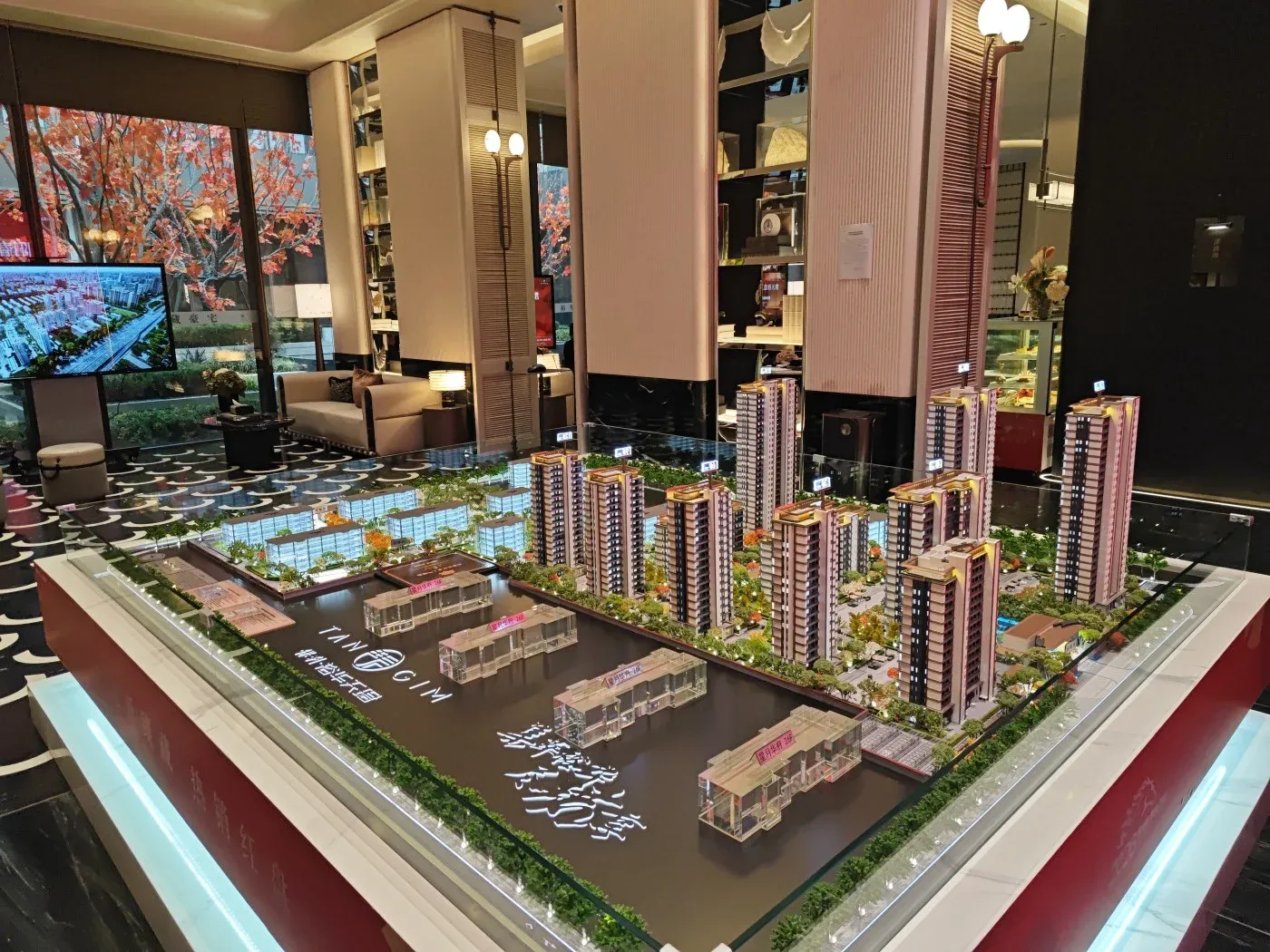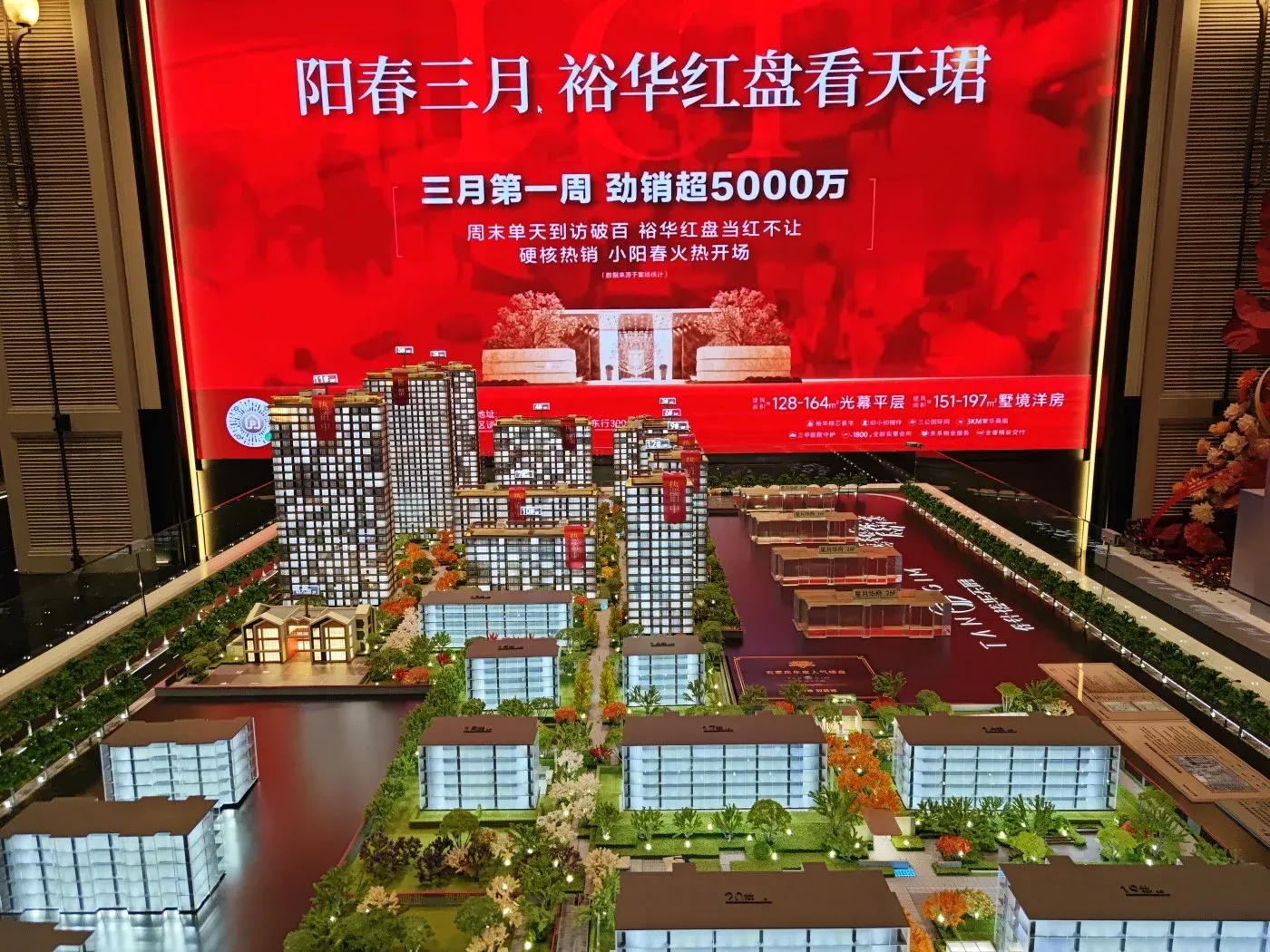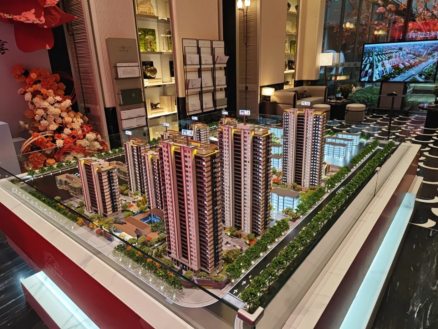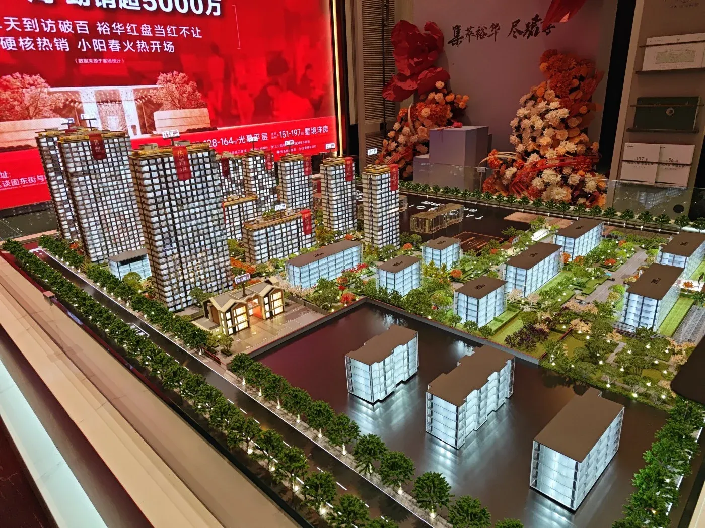 4. 35%绿化率搭配中央景观轴设计,现场展示的绿化效果图呈现多重立体植被层次。