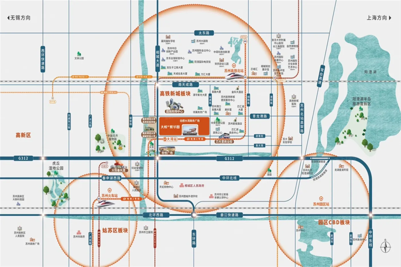 南门就是2号线大湾站,实测走到地铁口5分钟。亲测早高峰到苏州北站只要7分钟,出差星人直接住在高铁站边上是什么体验?北面中环北线+相城大道的组合,实测早高峰开往园区方向比想象中通畅。