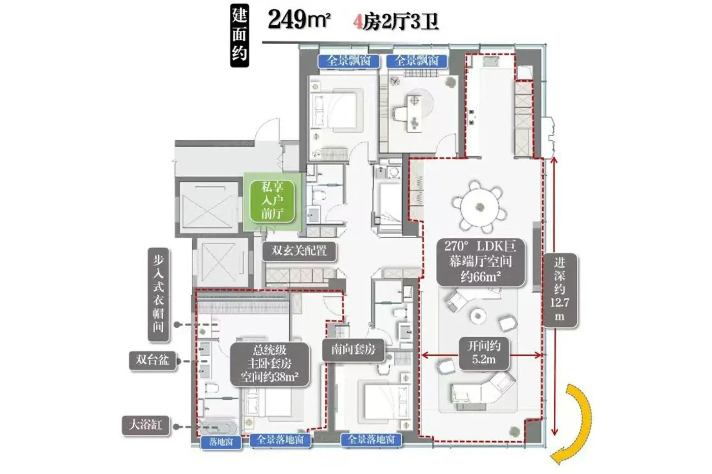 建面约270㎡户型确实用270°全景落地窗圈粉,但住进去才发现:白天阳光直射温度飙升,窗帘电费跑得比运河还快。约11.5米观景面把运河和天际线装进客厅,但隐私防护得靠全屋智能调光玻璃,科技buff叠满的同时,实用性反而被削弱。