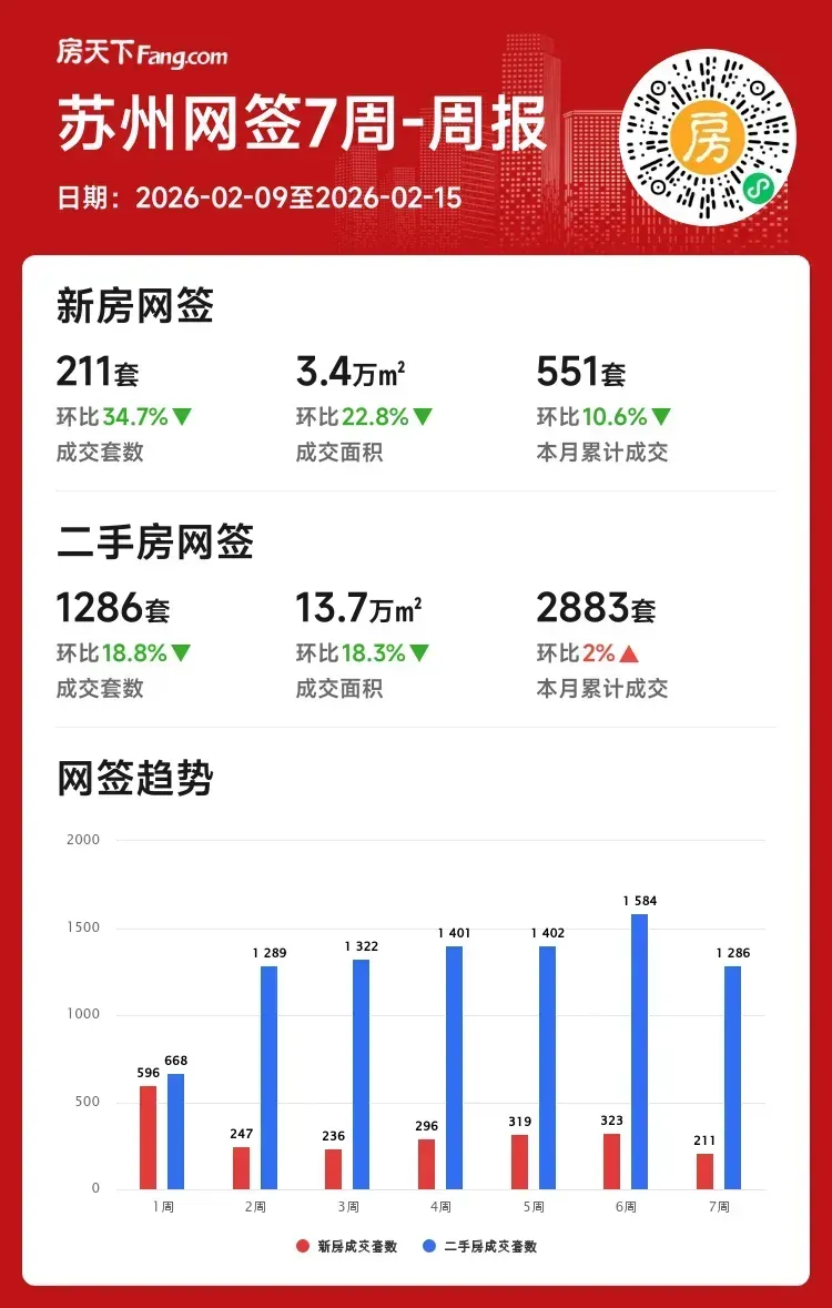 ✨春风送暖楼市行丨据最新备案数据,2月9日-15日苏州新房成交211套(环比-34.7%),二手房1286套(环比-18.8%)。新房市场短暂回调,二手房则展现出超强韧性!