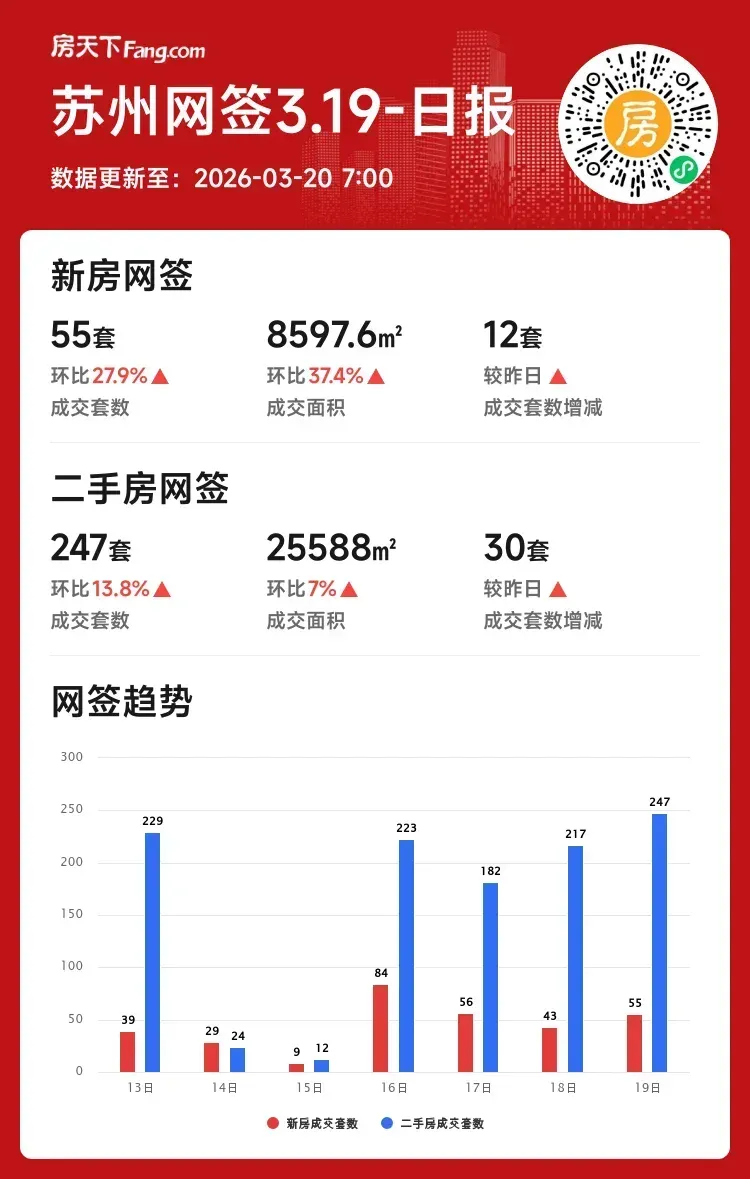 数据解读:苏州三月楼市成交数据全面上涨,新房市场尤其火爆,本月总套数环比涨幅接近翻倍,显示市场活跃度显著提升。
