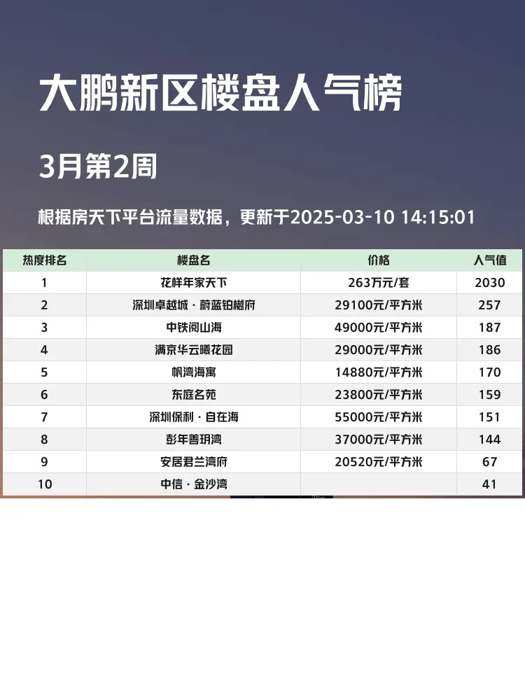 在当下楼市,选对楼盘就是选对生活!🏡 大鹏新区作为深圳的热门区域,购房者关注度持续攀升。这份人气楼盘榜单,帮你快速锁定优质房源,避开踩雷,轻松找到心仪的家!💡