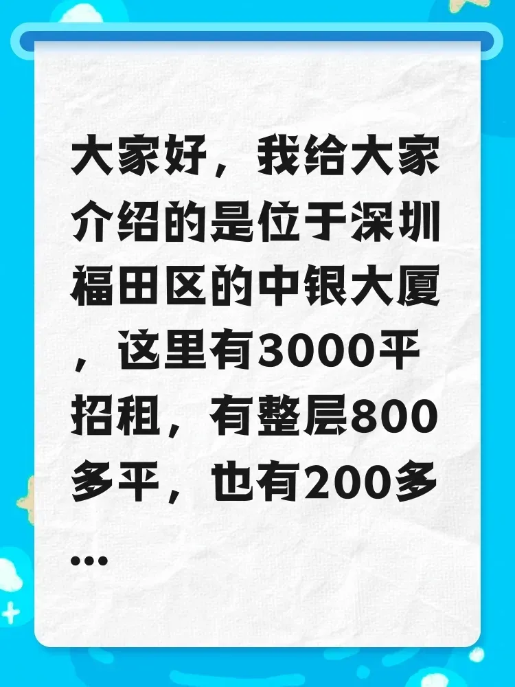 大家好,我给大家介绍的是位于深圳福田区的中银大厦,这里有3000平招租,有整层800多平,也有200多平的小面积,适合不同需求的租户。要说最好的就是它的位置了,楼下就是莲花村地铁站,对面就是莲花山公园,离福田高铁2.6公里,离福田口岸3.6公里,这个位置是无敌了。