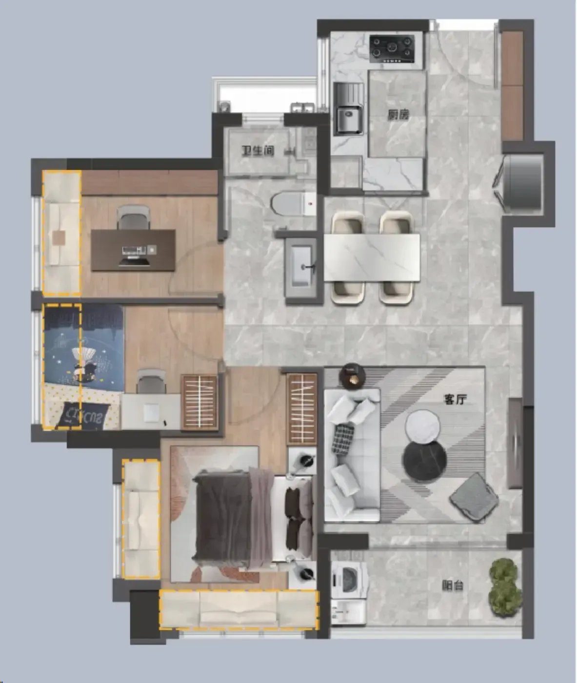 认识张小姐是在社区咖啡角,她把76㎡户型的飘窗改成了咖啡吧台。「开发商说这是赠送面积,我直接定制了嵌入式置物架」她边磨豆子边说。作为二胎家庭,动静分区是硬需求——主卧和儿童房用L型走廊自然区隔,客餐厨一体化设计让照看孩子更方便。