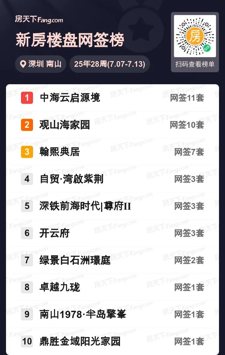 南山购房热潮持续升温!新鲜出炉的网签数据显示,中海云启源境以11套成交强势领跑,观山海家园以10套紧随其后,翰熙典居7套位列前三。自贸·湾啟紫荆等四个楼盘各斩获3套,绿景白石洲璟庭等三个项目亦有成交。