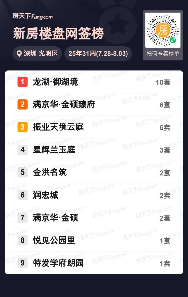深圳购房者的置业清单又有新变化!光明区上周网签数据新鲜出炉,豪宅盘龙湖·御湖境以10套成交量强势霸榜,满京华·金硕臻府与振业天境云庭各斩获6套并列第二梯队。值得注意的是,前十榜单中6成项目成交集中在改善型产品,区域内品质住宅热度持续攀升。