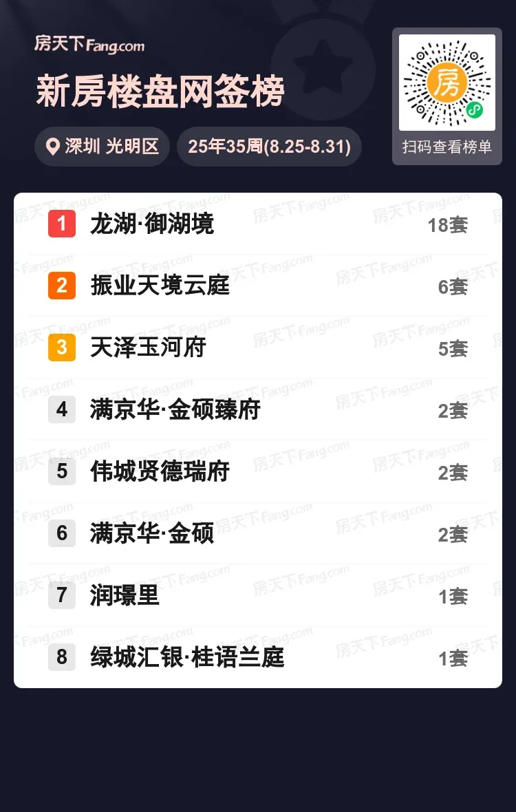 上周光明楼市暗流涌动,龙湖·御湖境以18套网签量霸屏榜单,这个数字比二至八名总和还要多!振业天境云庭和天泽玉河府分别以6套、5套紧随其后,其余楼盘则呈现冰火两重天的态势。从数据走势看,核心地段+品质配套的改善型项目正成为市场风向标,后续或将掀起新一轮产品升级热潮。想知道哪些楼盘还有捡漏机会?评论区留下你的看房故事,带你解锁光明置业新密码。