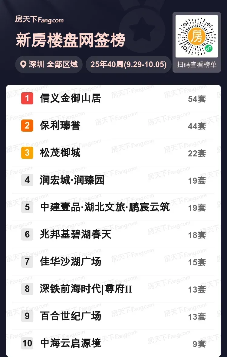上周深圳楼市现两大现象级成交,信义金御山居以54套成绩强势夺目,保利瑧誉以44套紧随其后,形成成交头部阵营。松茂御城则以22套成交位列第三,与前两名拉开明显差距。