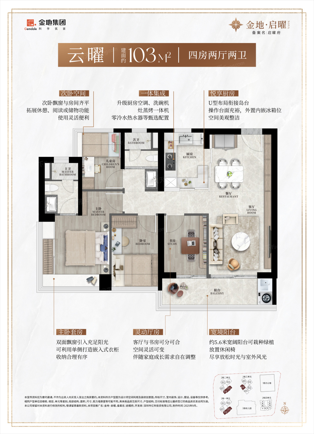 户型从93㎡灵活三房到130㎡阔绰四房,特别适合多代同堂家庭。样板间103㎡主卧自带步入式衣帽间,小夫妻过二人世界或预留儿童房都够用。不过厨房操作台面稍短,喜欢烘焙的家庭可能需要外接岛台。