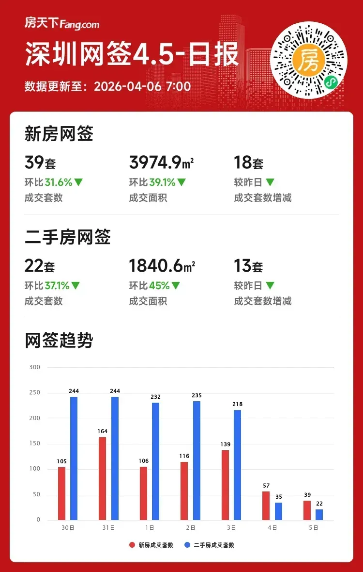 数据一眼看懂:深圳新房和二手房成交套数、面积环比全线下滑,市场活跃度明显走低,尤其是二手房面积跌幅近半。