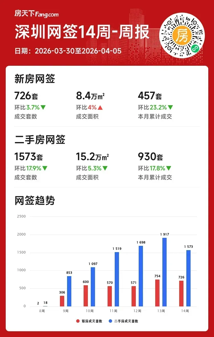 嘿,伙伴们!2026年第14周(3月30日-4月5日)深圳楼市整体呈现分化格局,新房成交726套,二手成交1573套,市场在动态调整中寻找平衡。😊