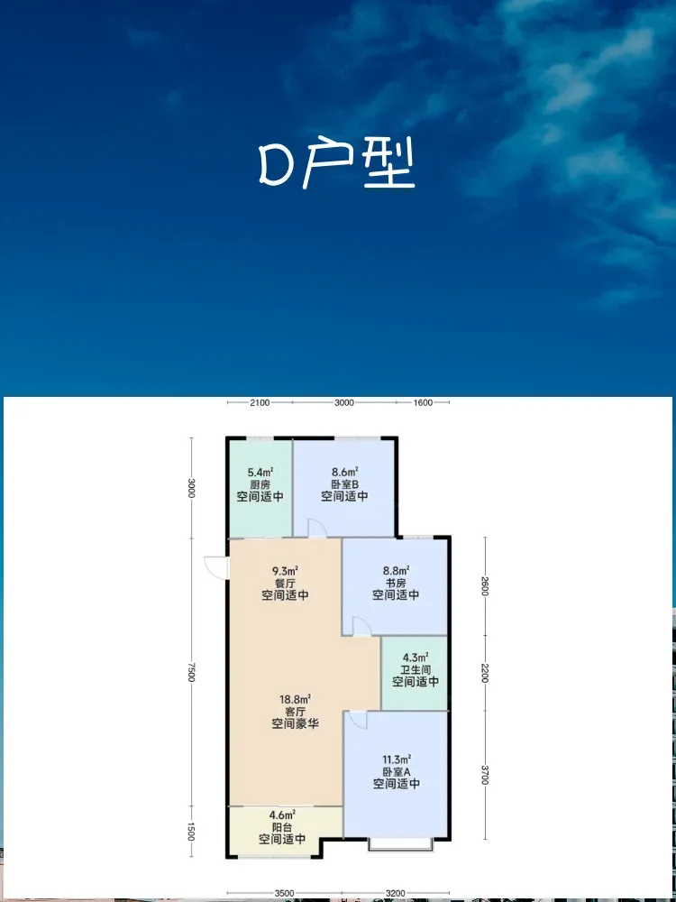 🌟D户型(3室2厅1卫,102㎡)