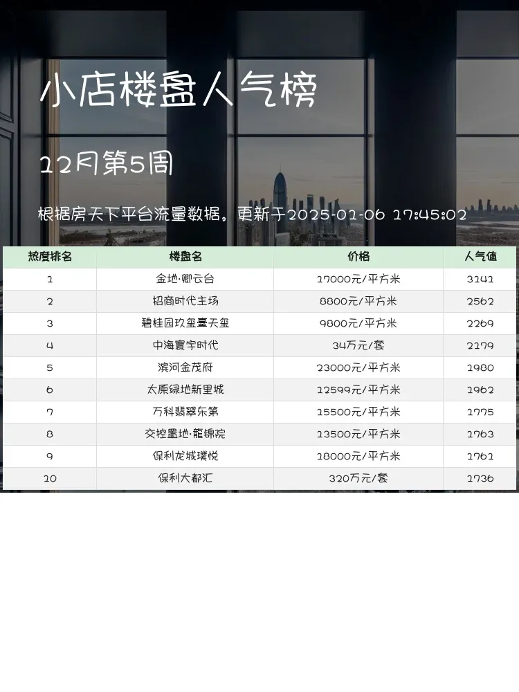 🏡 在当下的楼市中,选对楼盘就像为自己未来的生活下了一盘好棋。了解人气楼盘榜单,可以帮助购房者快速找到优质楼盘,节省时间和精力。在激烈的市场竞争中,位置、价格、配套等要素缺一不可,找到适合自己的才是王道。