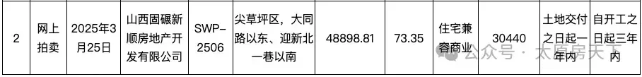 编号SWP-2506地块,位于尖草坪区,大同路以东、迎新北一巷以南。出让面积48898.81平方米,约73.35亩。土地用途为:住宅兼容商业。成交价30440万,受让人为山西固碾新顺房地产开发有限公司。该地块为南固碾城中村改造项目地块九。