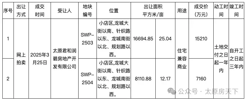 编号SWP-2503地块,位于小店区,龙城大街以南、针织路以东、龙城南街以北、规划路以西。出让面积16694.85平方米,约25.04亩。土地用途为:住宅兼容商业。成交价15210万,受让人为太原君和润碧房地产开发有限公司。该地块为北畔村城中村改造项目地块一。