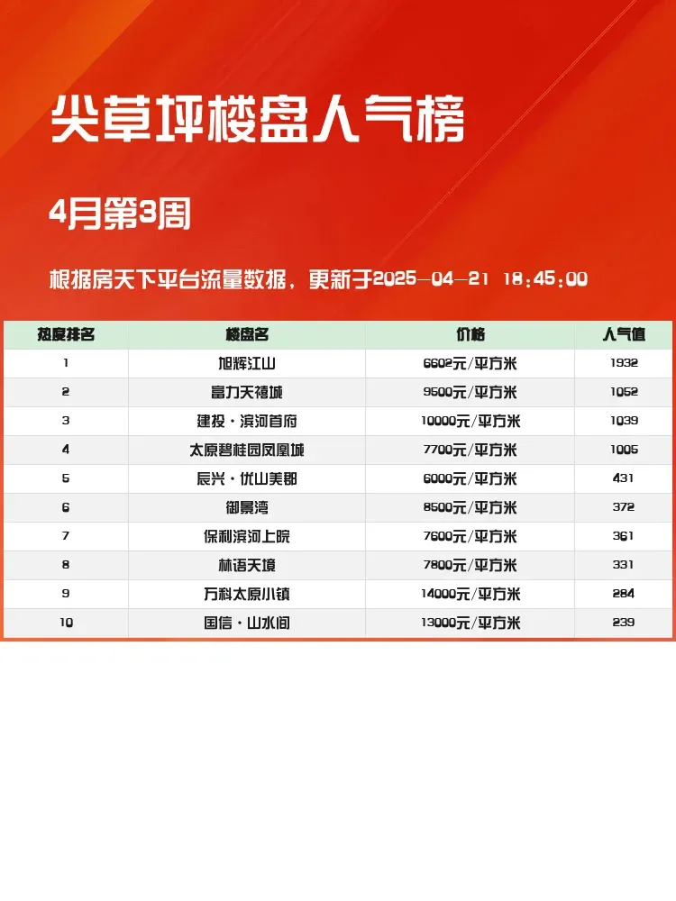 买房选对区域很重要!尖草坪作为太原北城发展重点,配套日益完善,房价却比主城区亲民不少💰这份人气榜单根据近期看房热度、成交数据综合评定,帮你快速锁定高性价比楼盘!跟着买准没错~