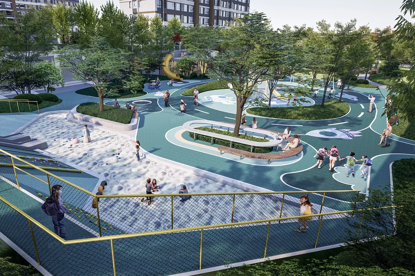 南大门设计大气恢弘,儿童区与庭院效果图显示全龄化活动空间规划;