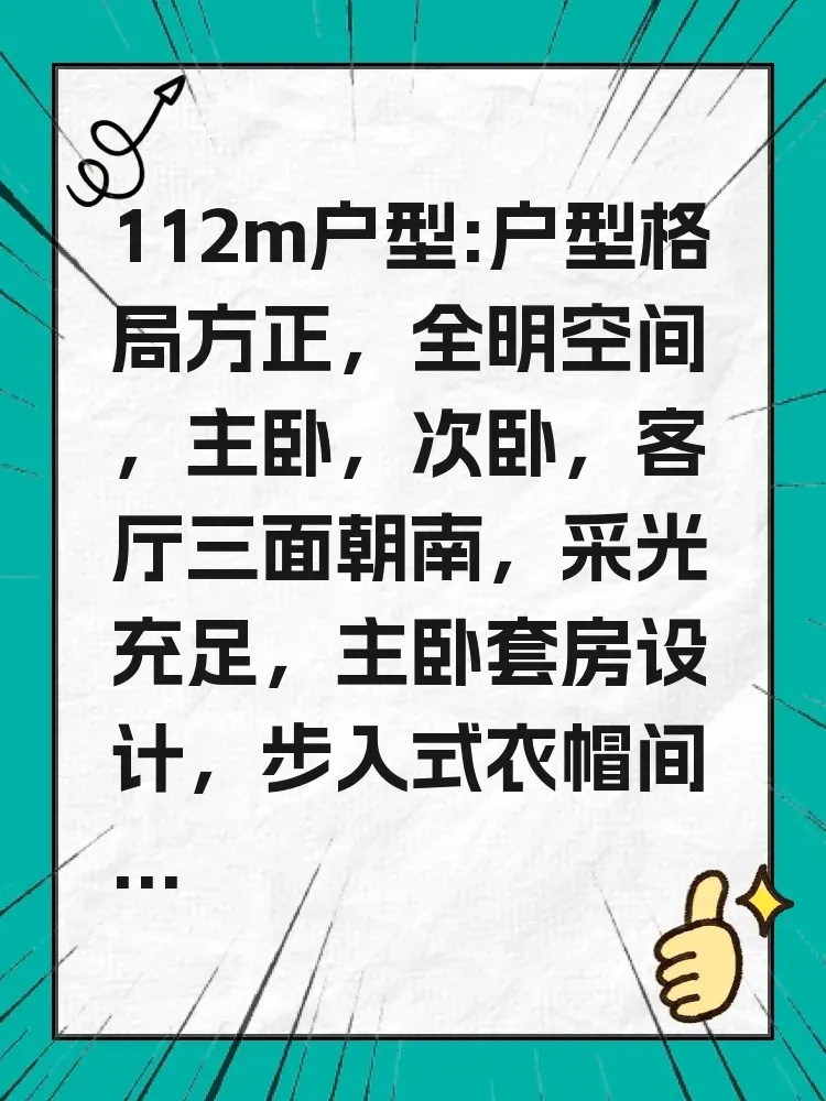 112m户型:户型格局方正,全明空间,主卧,次卧,客厅三面朝南,采光充足,主卧套房设计,步入式衣帽间,悠然私享生活!餐客分而不离,保证空间开阔,合理功能分区!