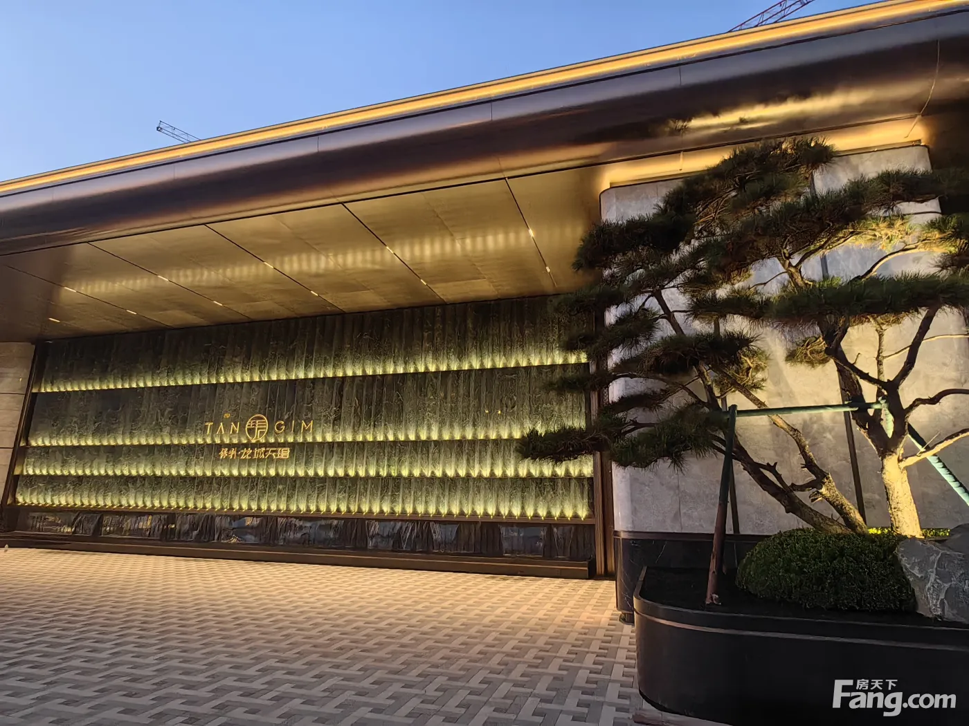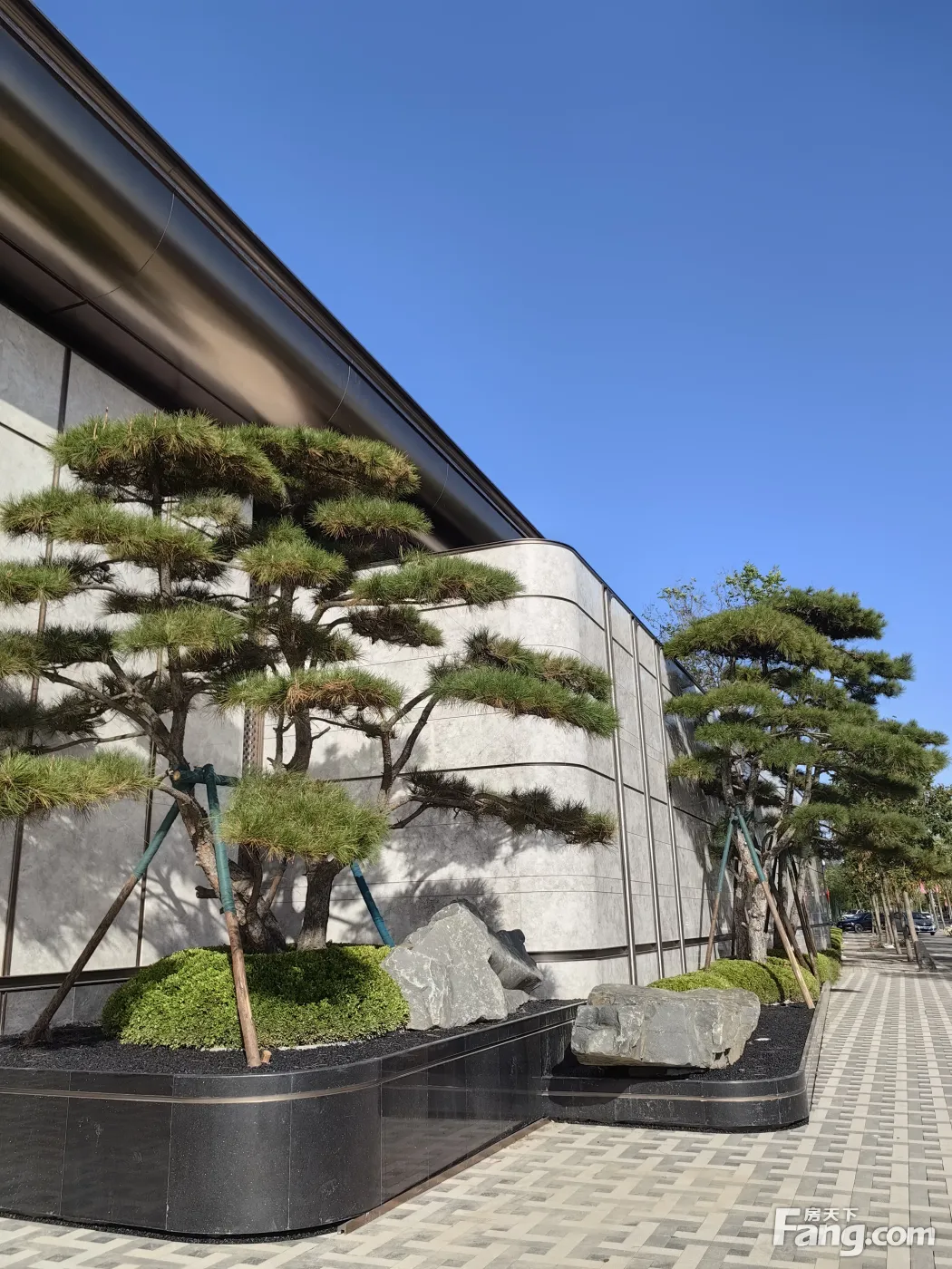 门头上方净高约6.5米,长约60米的超尺度悬挑雨棚与两侧超高景墙呼应了太原传统的“高墙大院 两侧高墙共耗费了约500平米的意大利蓝白奢石和星耀灰大理石及对景绿奢石 超越所有常规项目的尺度感带来的尊贵感和隐奢感顿