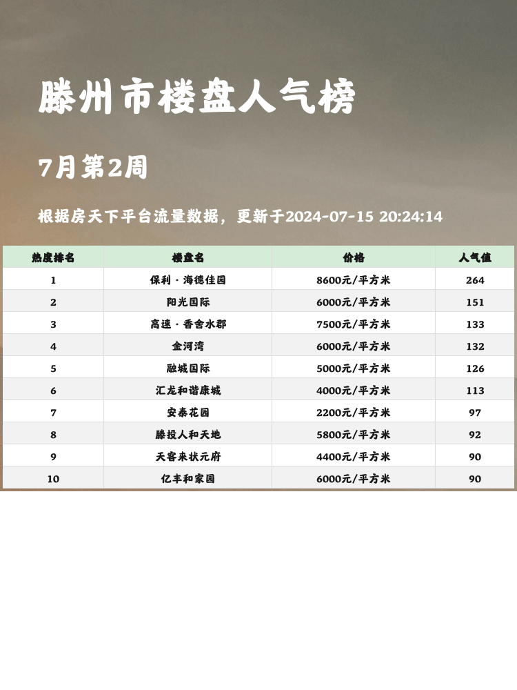 🏠 在当前市场,当选房变得尤为重要,选择人气楼盘榜单上的楼盘无疑是个明智的选择。人气楼盘往往代表了购房者的青睐和认可,从地段、配套到性价比都有较高的保障。今天,我们就来看看滕州学院东路的人气楼盘榜,看看哪些楼盘最值得关注吧!