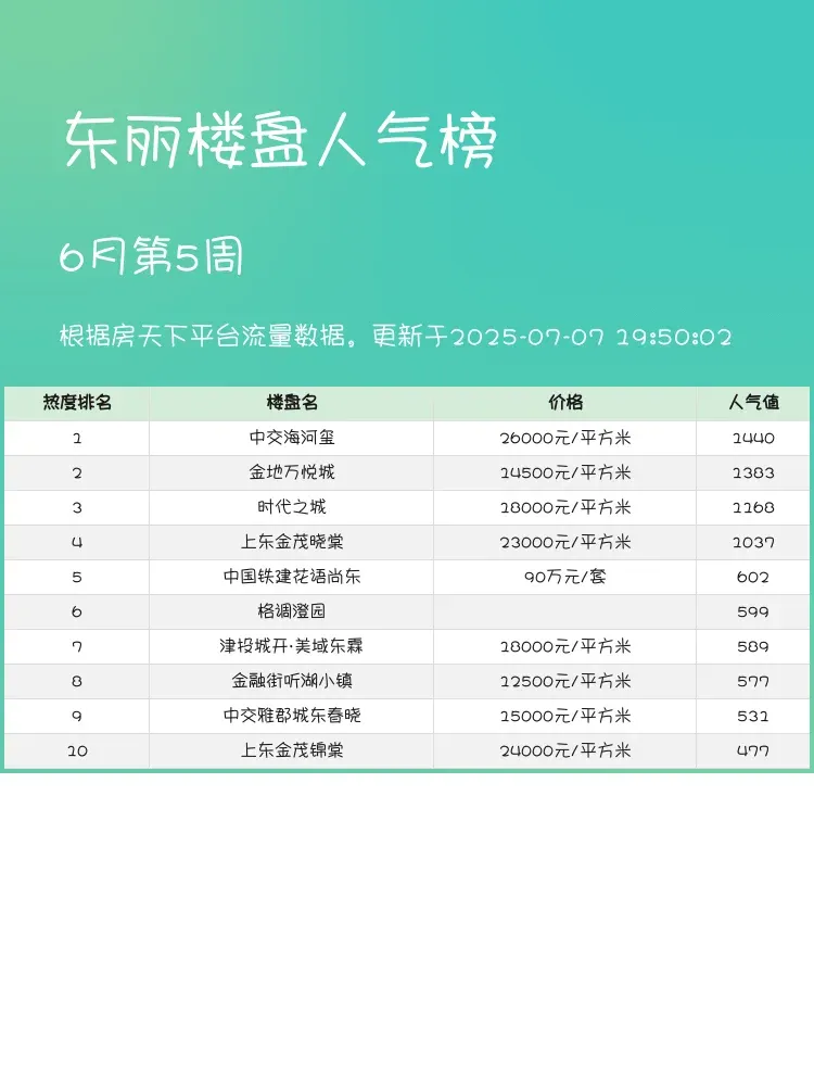 买房选房看榜单,跟着热度走准没错!🏆 当前市场下,交通便利、配套完善、户型实用的楼盘更受青睐。这份东丽区最新人气榜单,帮你快速锁定优质楼盘,省时省力不踩雷~快来看看TOP3都有谁👇