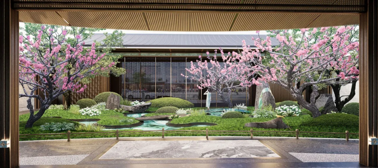 售楼处前后两处下沉庭院,将江南园林的写意挥洒自如,迎宾庭院主打礼序与规制,镜面水景将视线和情绪一同“收敛“,释放出静谧、安定的环境语言,完成归家的心境切换