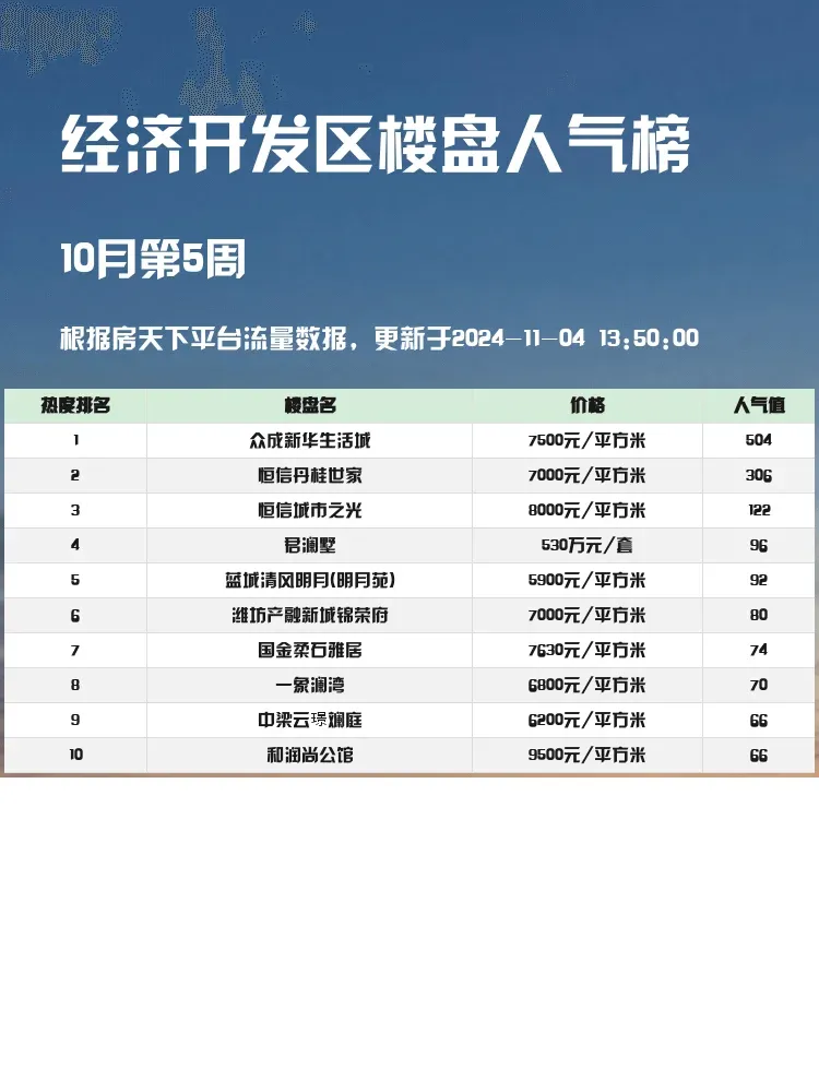 在买房这件大事上,大家总希望能够选到既有升值潜力,又能提升生活品质的楼盘🏠。因此,了解人气楼盘榜单是非常重要的,它为购房者提供最新市场热点与趋势,是选房时的得力助手📊。今天我们就来看看经济开发区的人气楼盘榜单,揭晓前三名的魅力所在👀。