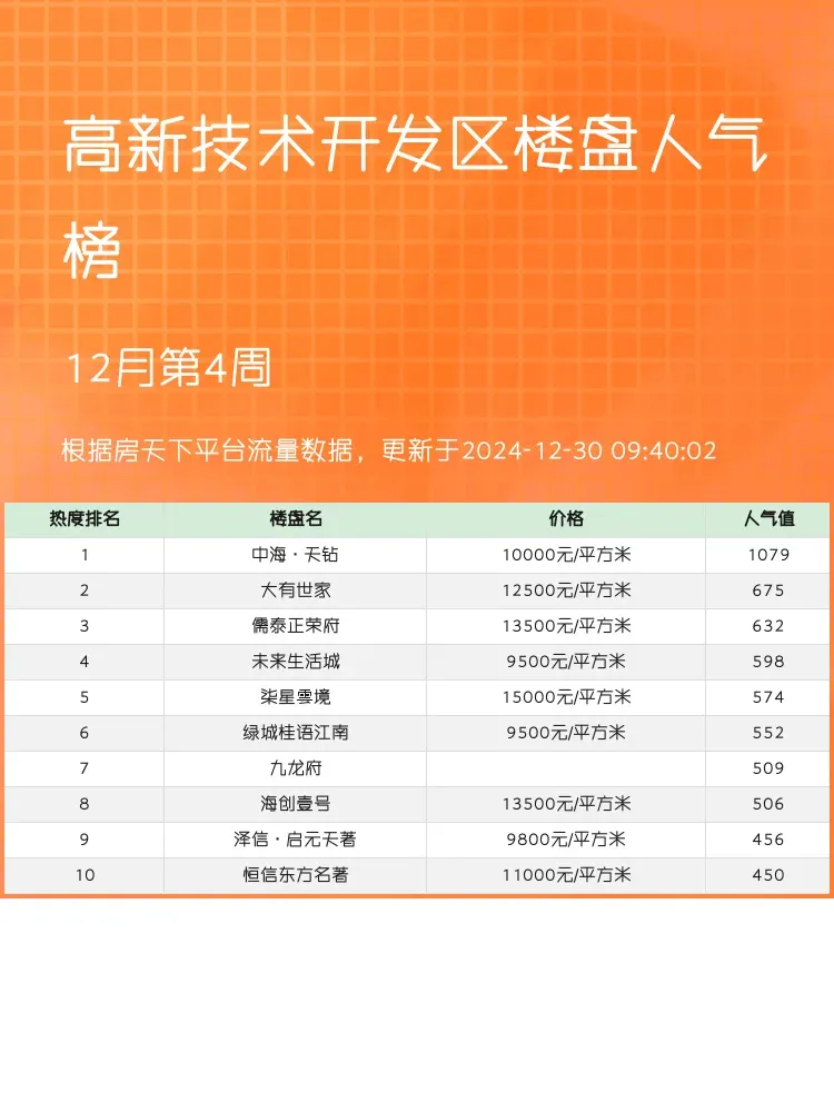 在如今房产市场波动频繁的大环境下,选择一个优质的人气楼盘显得尤为重要。🏡如何在众多楼盘中慧眼识珠?关注人气榜单可以为买房者提供不少的实用信息,帮助购房者迅速锁定优质楼盘。下面就为大家带来高新技术开发区的人气楼盘前三名,希望为大家的置业之路提供一些参考。🔍