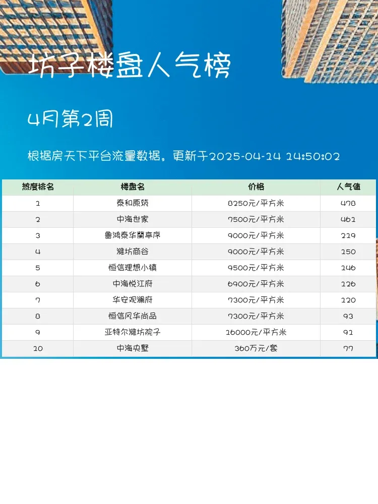 买房选房看榜单准没错!🏡 当前市场下,购房者更关注性价比和居住品质,人气楼盘榜单能直观反映市场真实热度。这份坊子区最新榜单,从价格、户型到配套都经过严格筛选,帮你快速锁定心仪好房~💯
