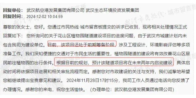 有人咨询关于植物园隧道的建设进度和时间