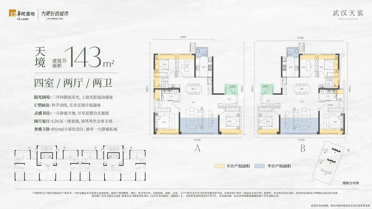 143平:四房,2梯2户,得房率约90%