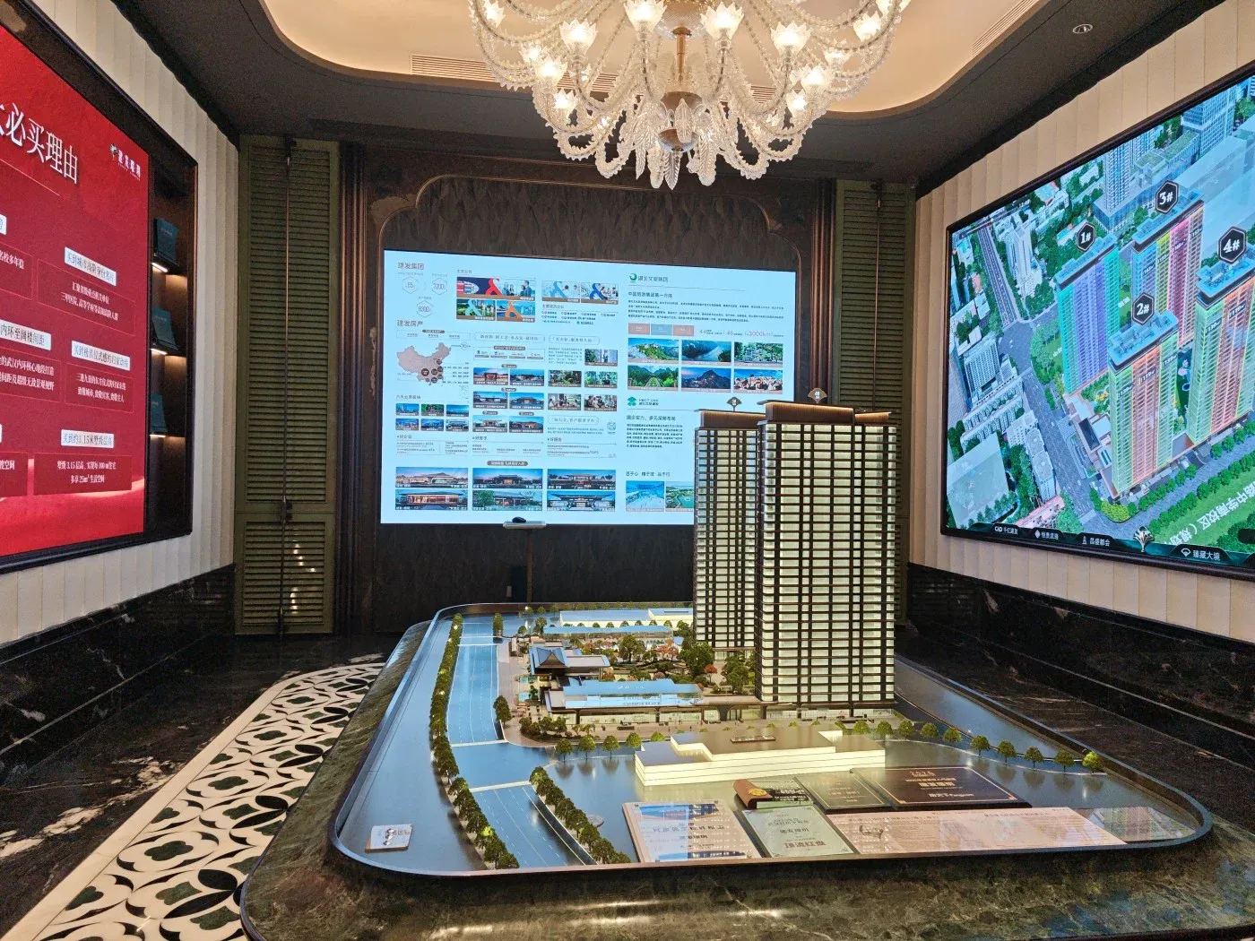 【产品定位】开发商主打“中式地产”标签,从展示中心细节可见飞檐、格栅等传统元素,适合偏好新中式风格的改善客群。