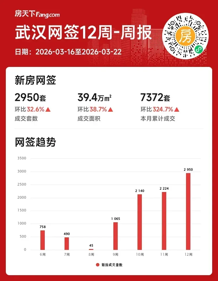 本周武汉楼市可谓“春意盎然”,市场活跃度明显提升!从2026年3月16日至3月22日,新房成交套数达到2950套,数据亮眼✨。