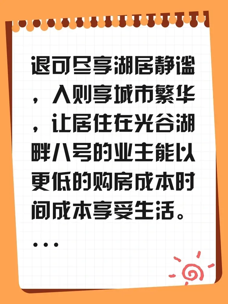 退可尽享湖居静谧,入则享城市繁华,让居住在光谷湖畔八号的业主能以更低的购房成本时间成本享受生活。所以,无论是投资还是自住,湖畔捌号项目都将会是您最好的选择!