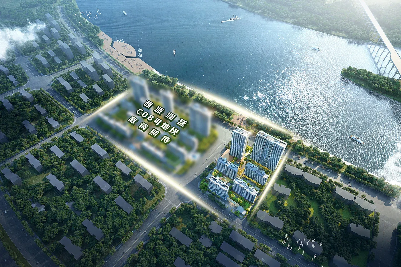 双地块布局形成超400米连续江岸线,63%楼栋具备观江视野。建面约105㎡户型实现三向观江效果,118㎡户型配置16米连续观江面。居住品质方面,全系产品配置3.15米层高与6米挑高架空层,近600米风雨连廊形成全天候归家动线。