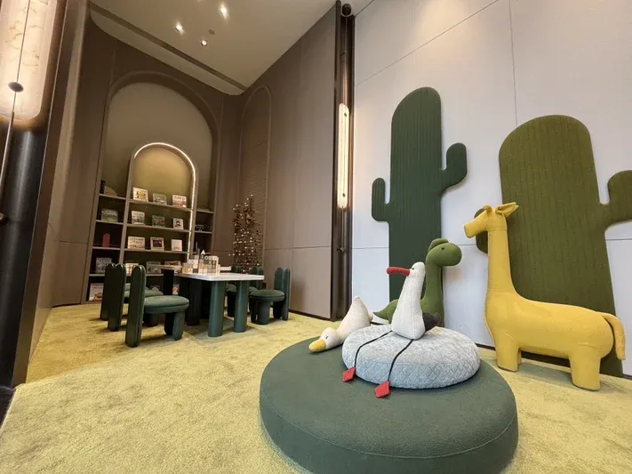 儿童活动区内以浅色饰面板配绿色主题色地毯为空间主色调,营造空间自然放松的气息。种类多样的绘本,让孩子在这里可以安静的看书!