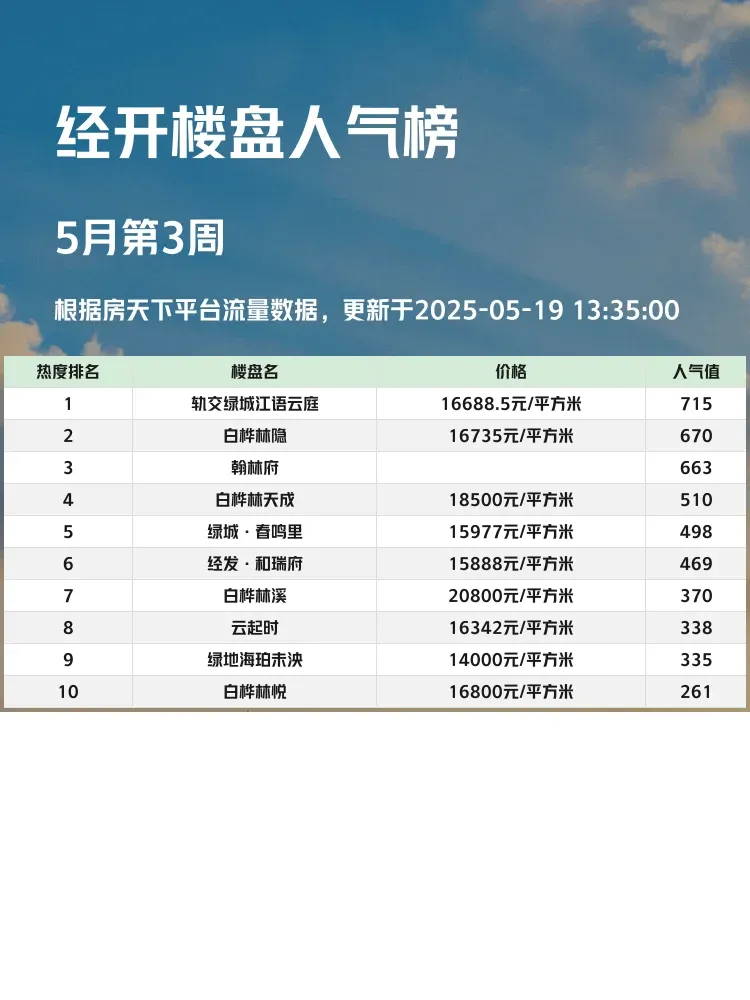 买房不看榜单就像盲选盲盒💣!当前市场下,跟着人气选盘既能避开冷门坑,又能享受成熟配套红利✨。这份经开真实热度榜,用数据告诉你哪些楼盘真正被购房者用脚投票~