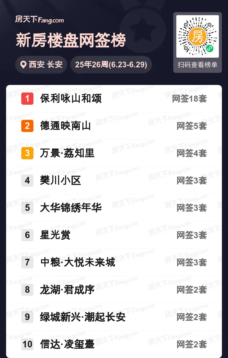 长安区楼市上周出现明显分化,保利咏山和颂单周网签18套一骑绝尘,相当于后九名成交总和。德通映南山以5套紧随其后,万景·荔知里、樊川小区等七个项目成交集中在2-4套区间。从成交分布来看,核心地段项目仍受青睐,但改善型产品开始展现潜力。随着主城区土地供应趋紧,预计下半年品质住宅项目将迎来更多关注。你最近在看哪里的房子?欢迎留言区交流选房心得~