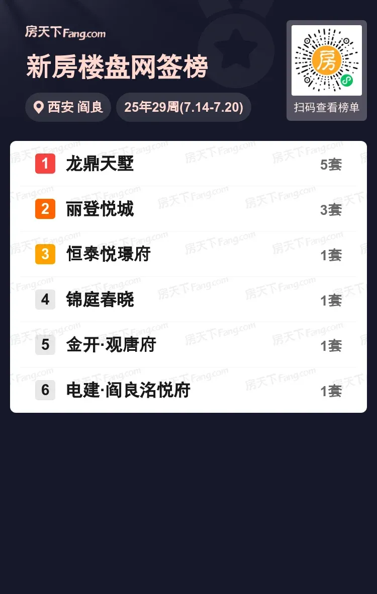 阎良楼市最近有点意思!上周网签数据新鲜出炉,龙鼎天墅以5套成交稳坐榜首,丽登悦城3套紧随其后,其他楼盘保持低调。值得关注的是,前两名项目就包揽区域8成成交量,这个夏天购房者的选择倾向很明显了。