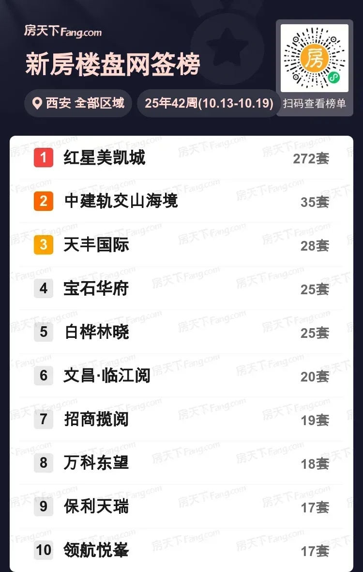 上周楼市数据太震撼!位于城南的红星美凯城以单周272套网签量形成断层式领先,这个数据相当于榜单第二名到第五名的总和。首次入市的轨道交通盘中建轨交山海境以35套位列第二,曲江文化带的文昌·临江阅和港务区的招商揽阅双双进入前十。