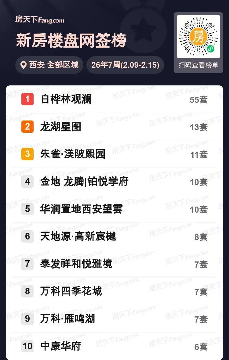 上周西安楼市燃起开年首波热潮!白桦林观澜以断层式优势拿下区域销冠,单周狂揽55套成交,比榜单2-5名成交总和还多出15套!龙湖星图、朱雀·渼陂熙园等品质盘分别以13套、11套跻身前三。值得关注的是,高新、雁鸣湖板块多盘集体发力,改善型项目占据榜单半壁江山。随着房贷政策持续优化,预计未来两周品质三房、四房产品还将迎来新一波成交高峰。哪个楼盘会成为你的心动选择?欢迎留言分享置业故事~