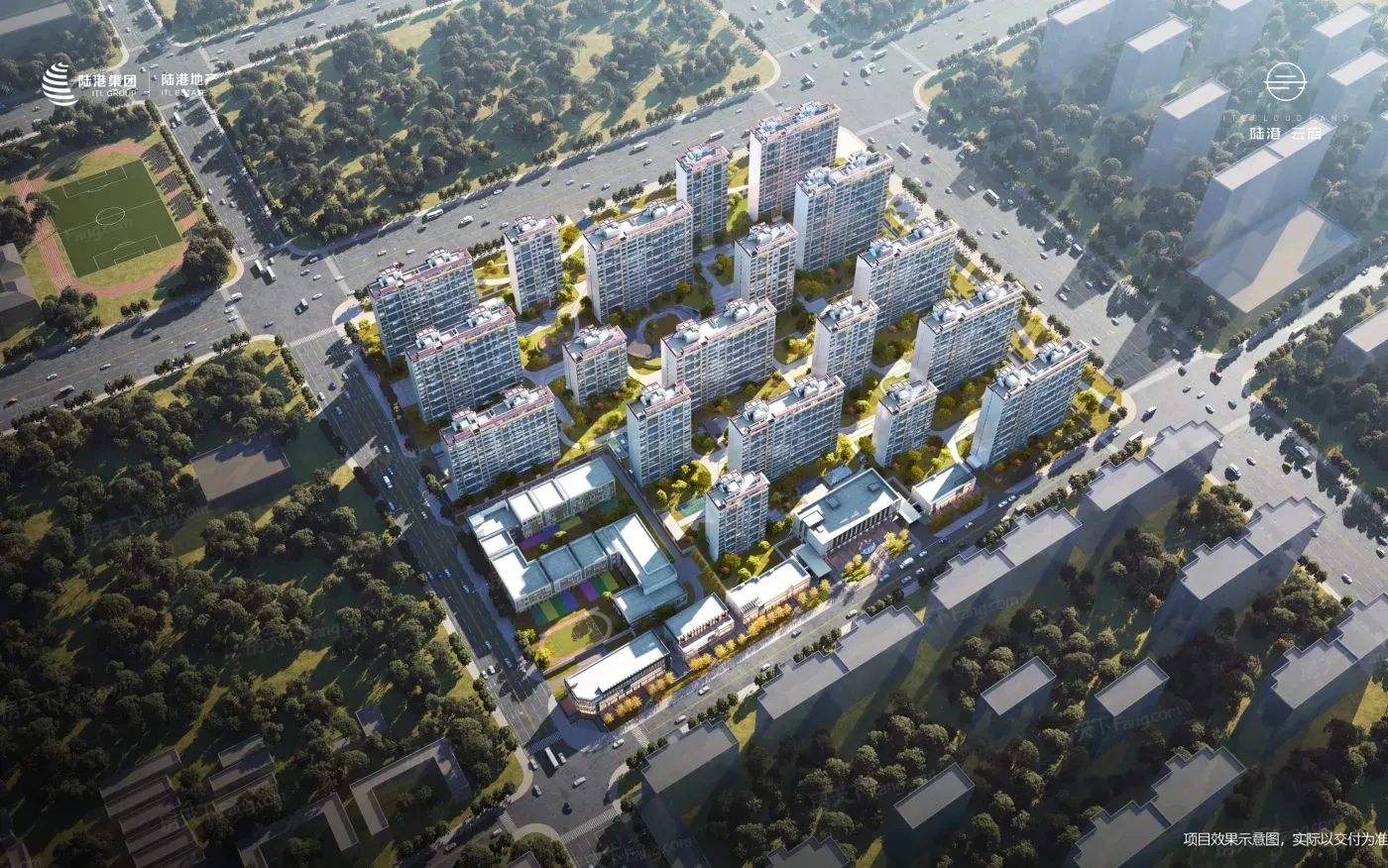 浐灞国际港奥体板块的陆港·云启计划2026年4月交付,国企开发171-234㎡大平层产品。项目紧邻交大陆港第四学校,步行范围内可达奥体中央公园。社区规划五重景观体系,形成轴庭结合的景观布局。