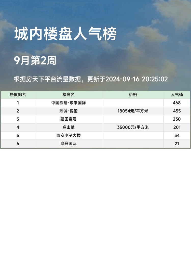 🏠买房怎么选?看人气楼盘榜单!在当下的楼市中,选房不仅要看地段、配套,还要对比各方信息,了解人气楼盘的优缺点。今天给大家带来西安城内的人气楼盘榜单,实用信息满满,助你找到理想新家。
