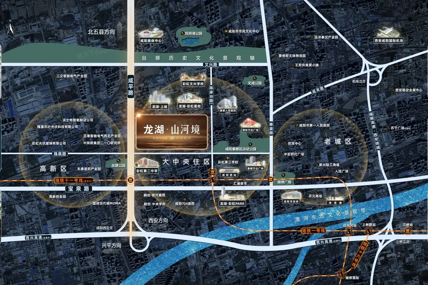 高新区科技住宅与教育配套并举,代表项目如鑫苑·又一程臻境(容积率3.0);秦都区集聚品牌房企,龙湖·山河境(容积率3.5)等项目形成产品梯度;西咸新区沣西新城项目主打高端改善,典型如容积率2.3的低密社区。